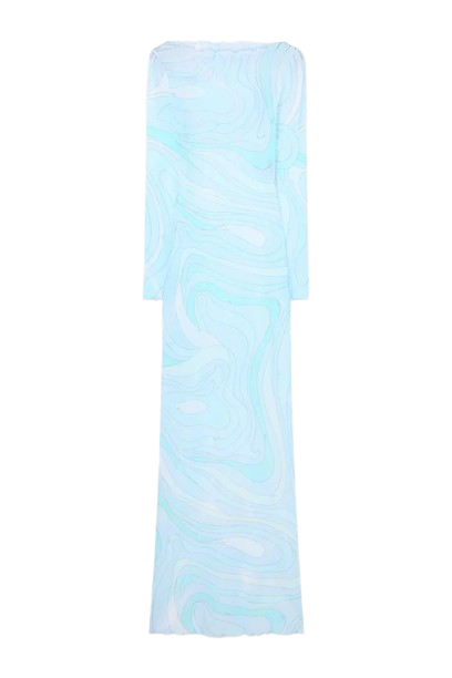 This semi-sheer mesh maxi dress features swirling, Pucci-inspired prints designed to turn heads from every angle. Cut with a fluid silhouette and long sleeves, it skims the body effortlessly while offering just the right amount of drama.