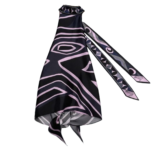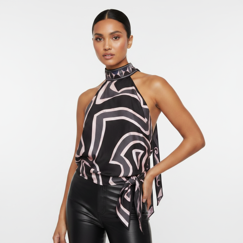 The Indie Halter Top features a black fabric adorned with a geometric purple pattern, designed for both style and support. The halter neck provides added comfort and enhances the shoulder line, making it suitable for various occasions. This top combines aesthetic appeal with functional design for everyday wear.