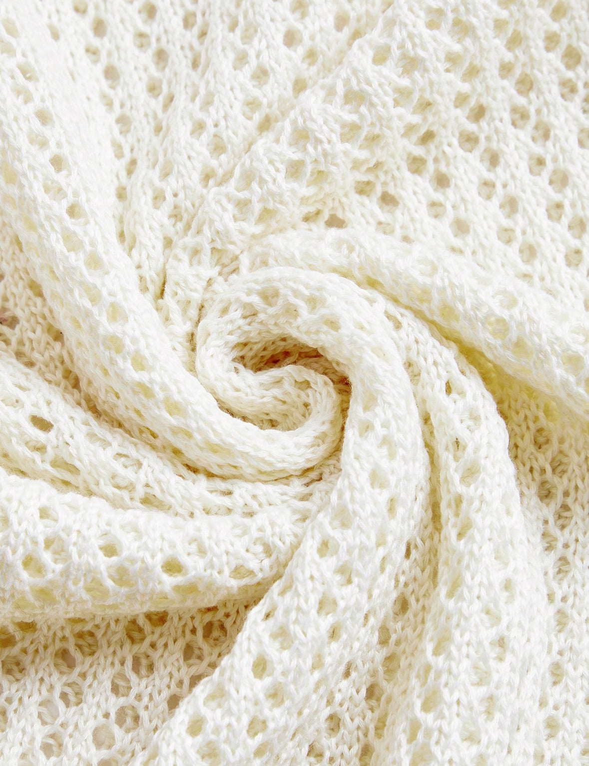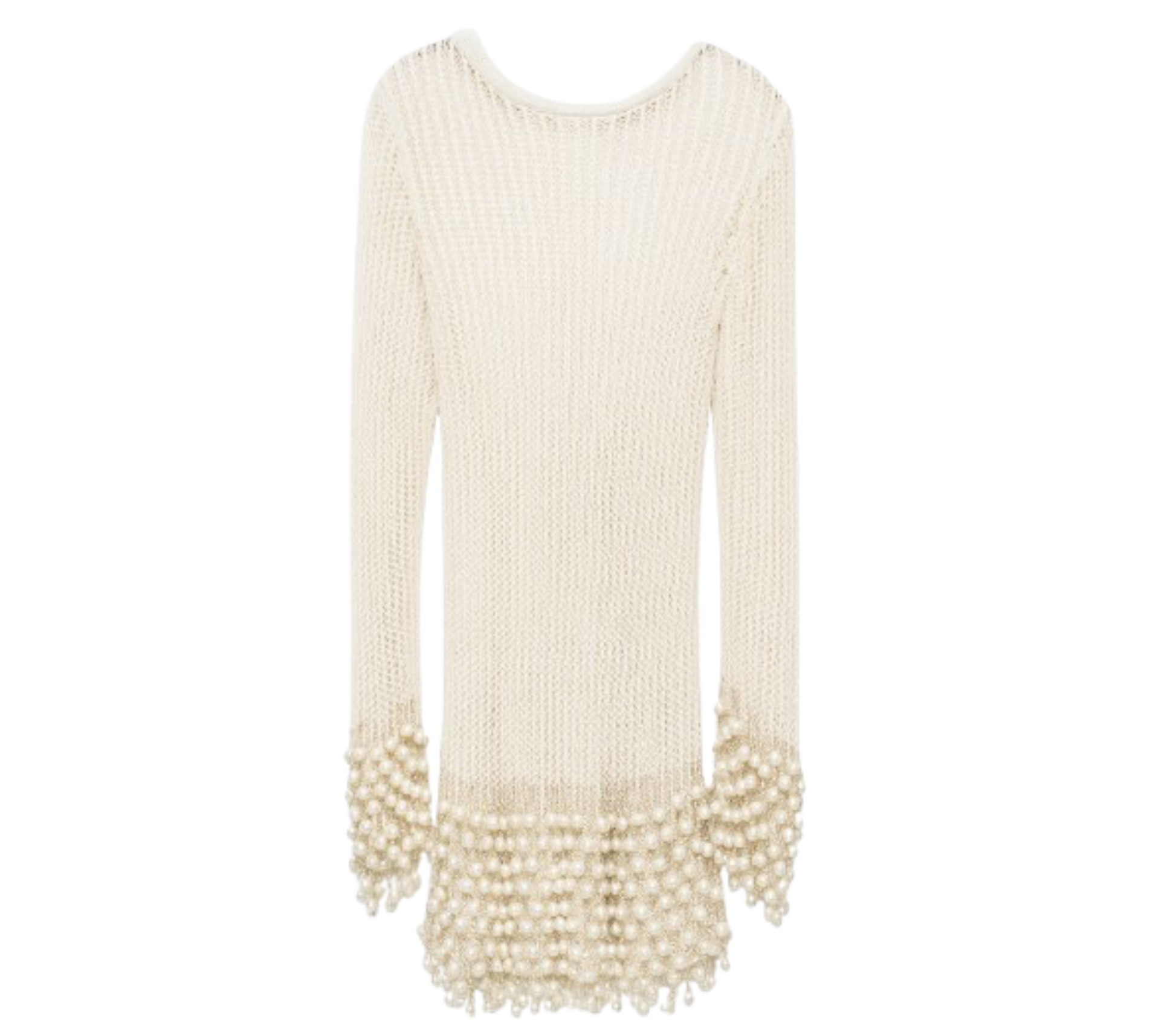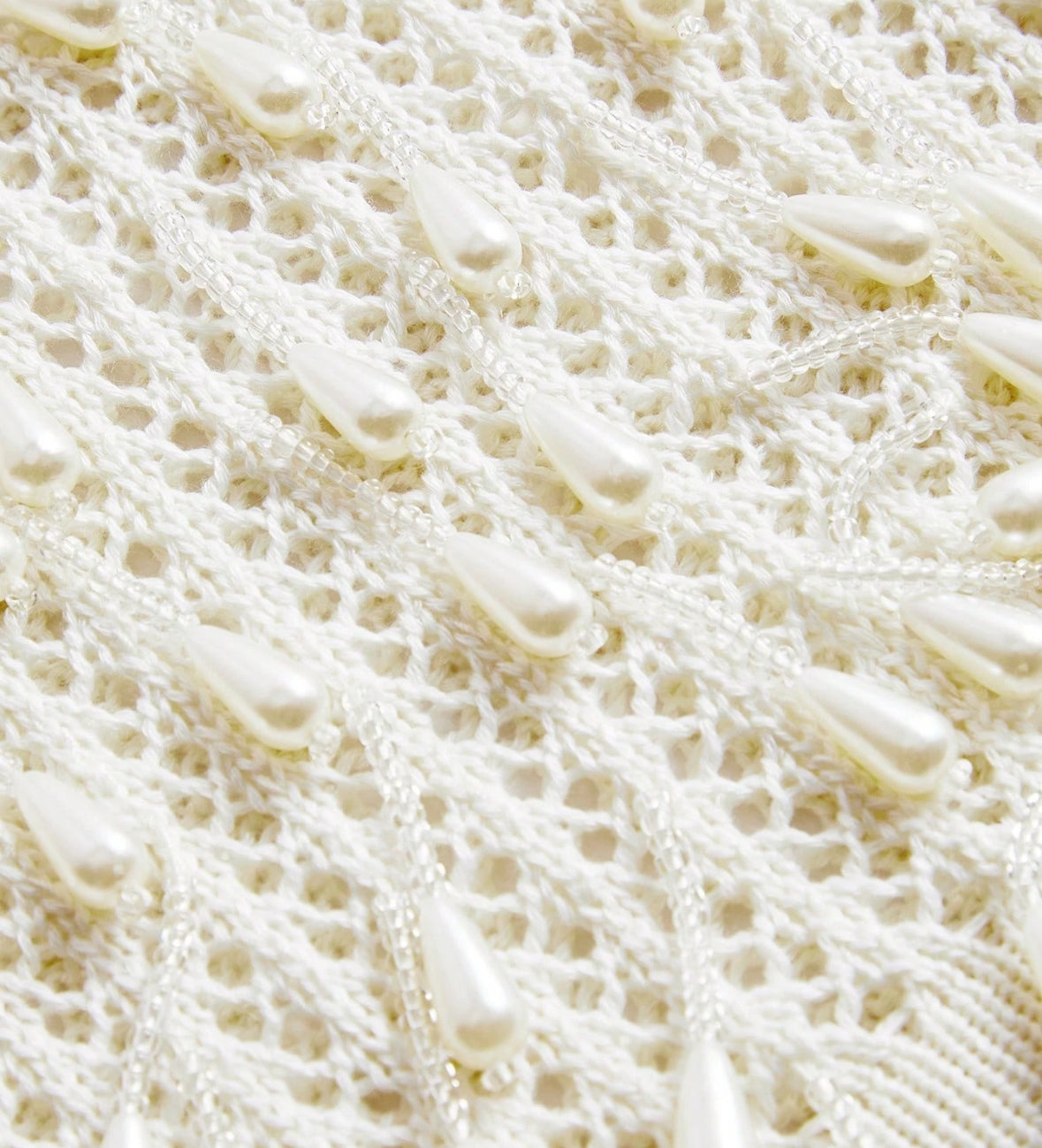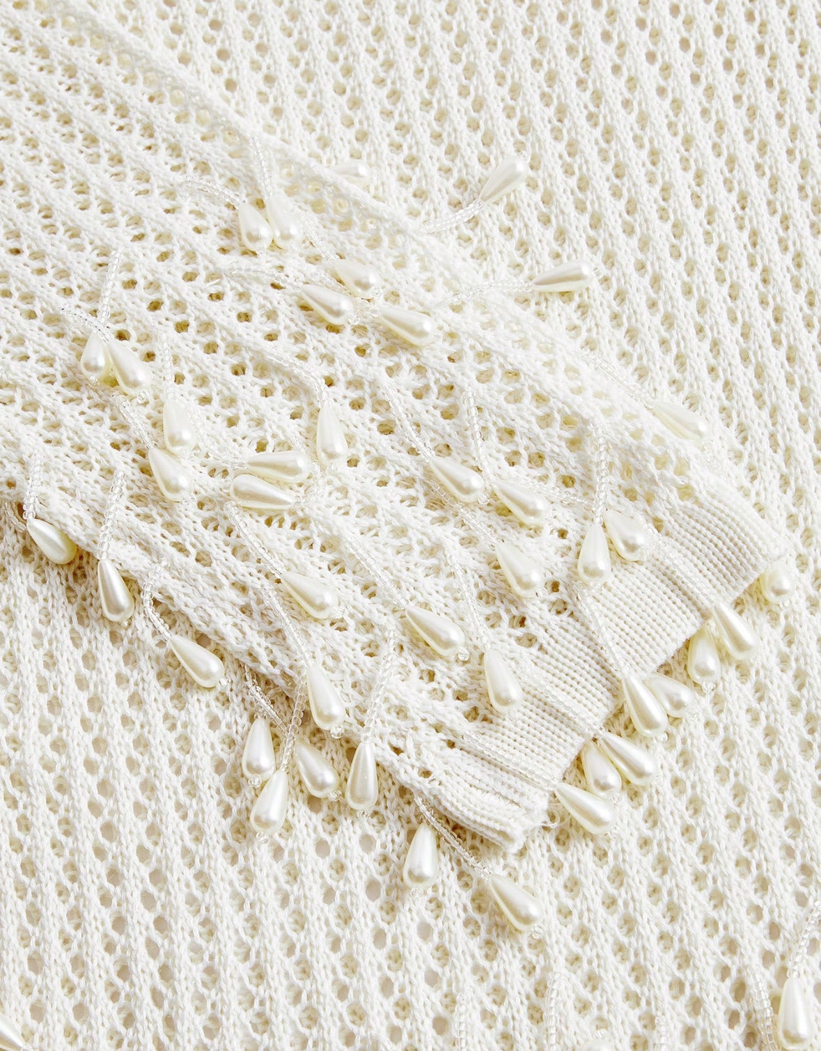 Introducing the Jamee Dress, a cream-colored crochet mini dress that exudes elegance with pearl drops delicately adorning the sleeves and hem. Achieve a sophisticated and stylish look with this dress, perfect for any special occasion.