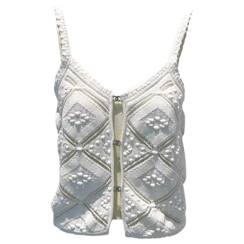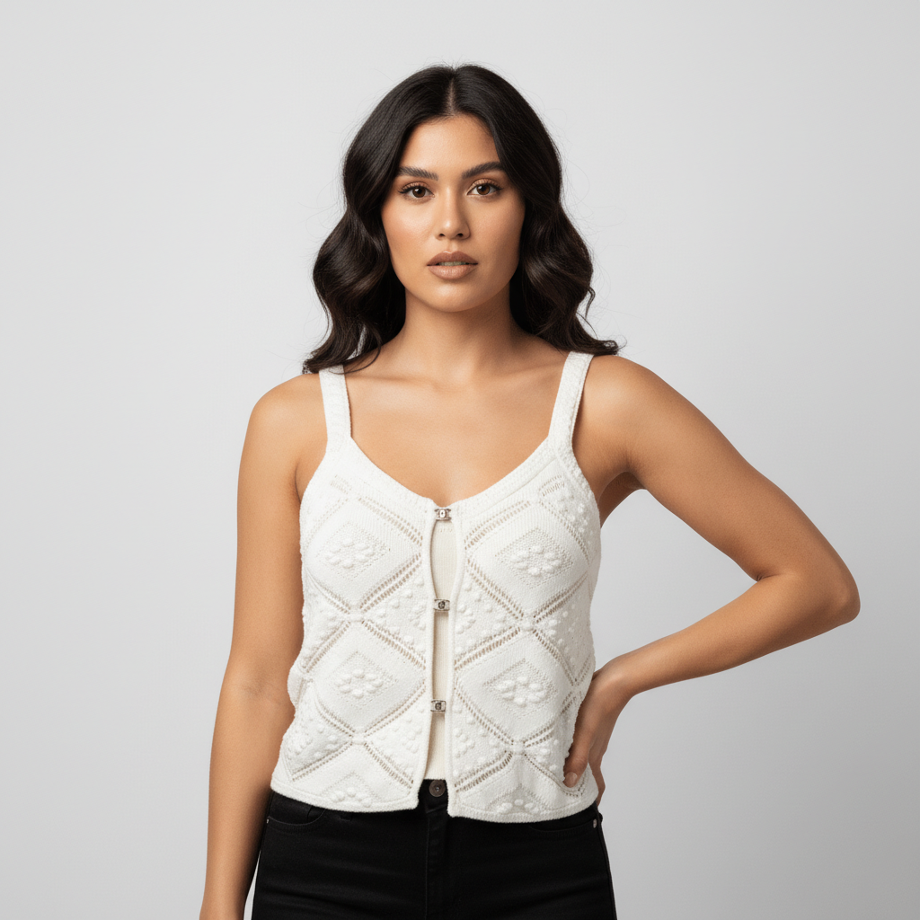 The Juanita Cami is a crochet knit top designed for breathability and comfort. The intricate knitting technique ensures a lightweight fabric, allowing for effective moisture management. Ideal for layering or standalone wear, this cami combines style with practicality, enhancing versatility in your wardrobe.