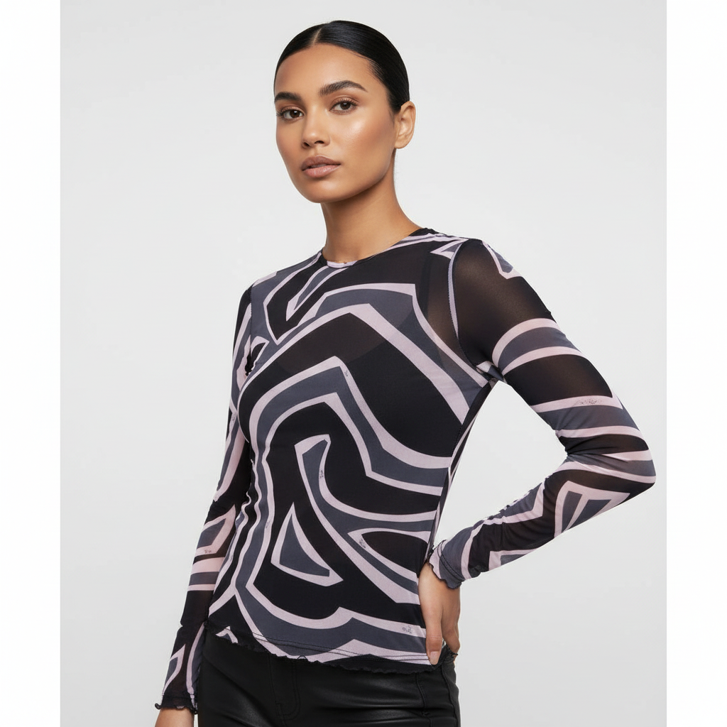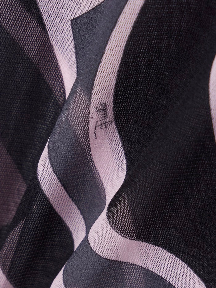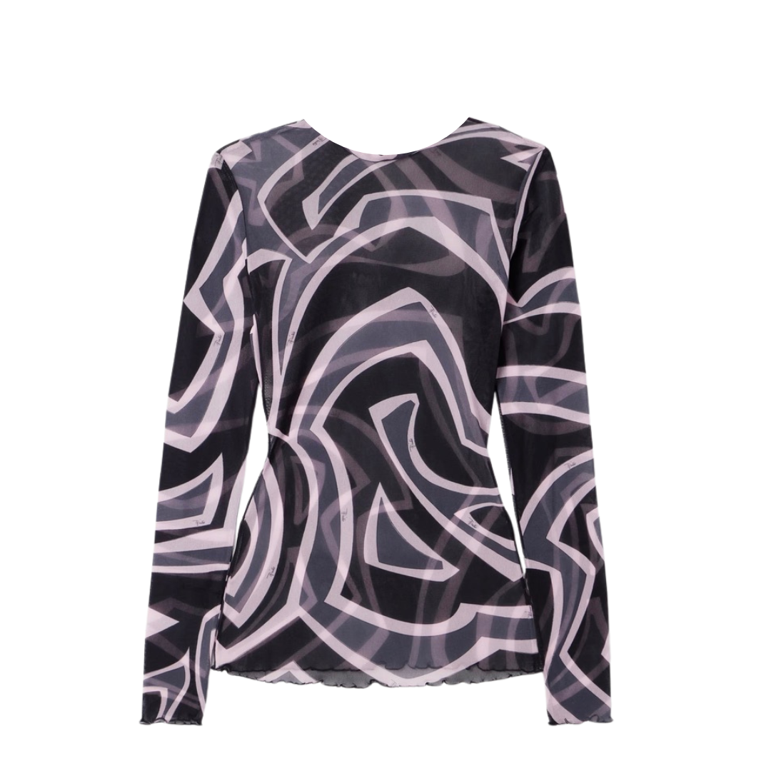 This semi-sheer mesh long sleeve top dress features swirling, Pucci-inspired prints designed to turn heads from every angle. Cut with a fluid silhouette and long sleeves, it skims the body effortlessly while offering just the right amount of drama.
